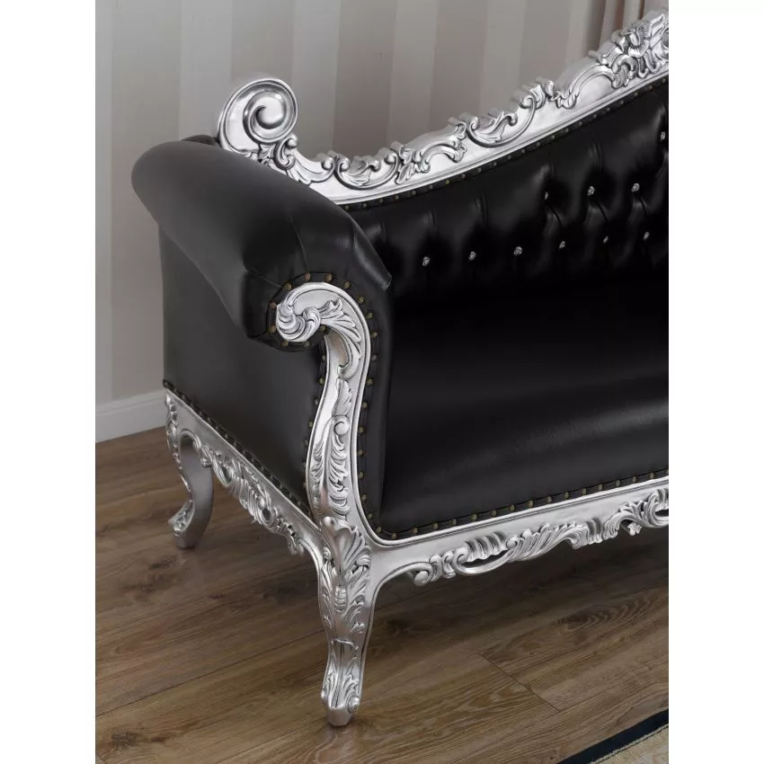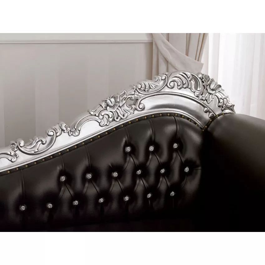 Alejandra Hand Carved Teak Wood Leatherette 3-Seater Chaise Longue Sofa Silver Leaf ( Black )
