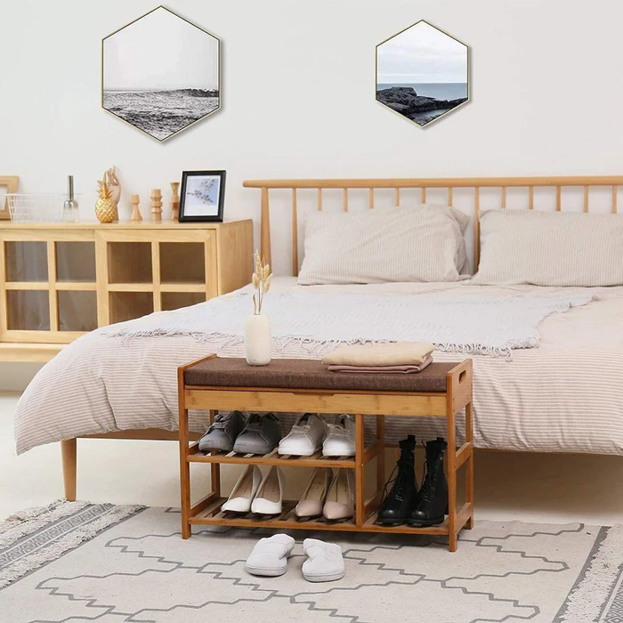 Maximize your space with the Natural Art & Crafts Bamboo 3-Tier Shoe Rack Bench with Cushion. This eco-friendly shoe storage solution is perfect for entryways, bedrooms, and hallways, offering a stylish blend of organization and comfort. With a sturdy bamboo frame, this 3-tier rack holds multiple pairs of shoes while the cushioned seat provides a comfortable place to sit while putting on or removing footwear. Designed to fit seamlessly in small spaces, this shoe rack bench is not only practical but also adds a natural touch to your décor.