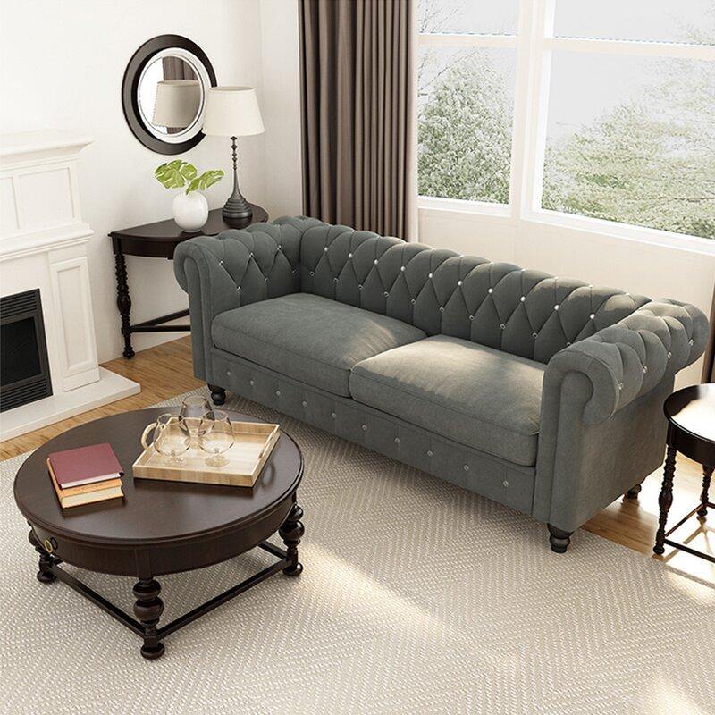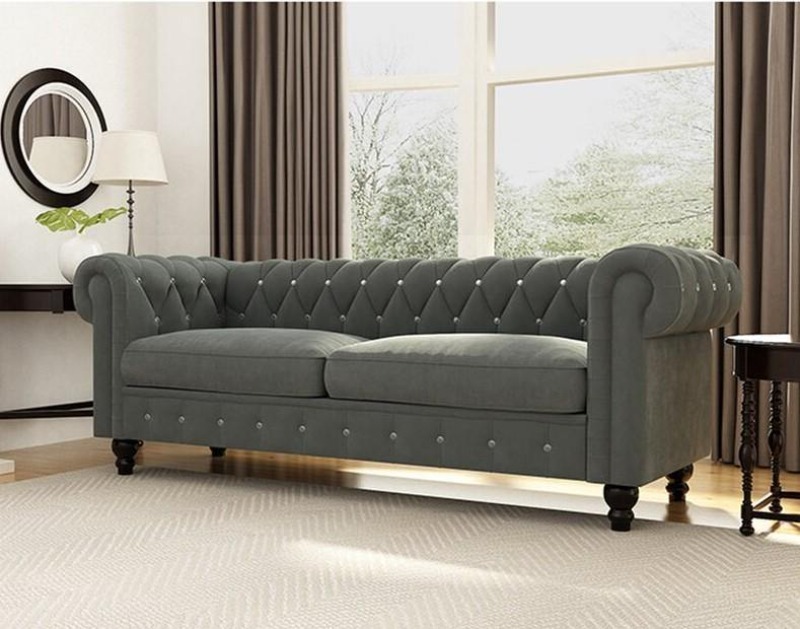 Graceful 3-Seater Velvet Fabric Button Tufted Rolled Arm Chesterfield Sofa ( Grey )
