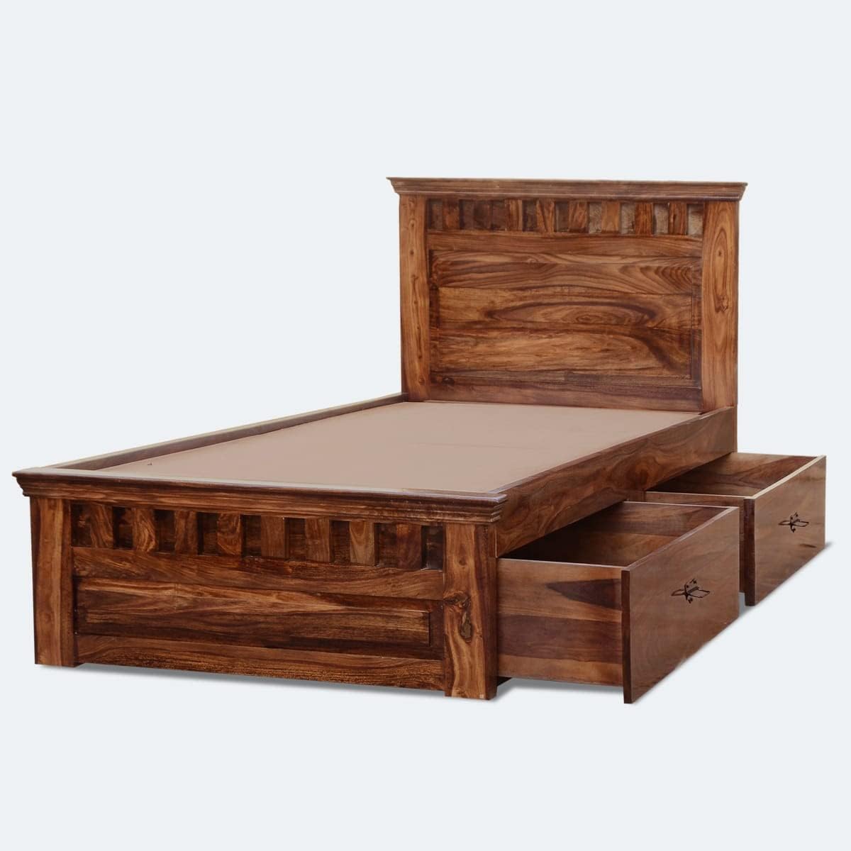 Natural Art & Craft Siramika Handmade Teak Wood Hostel Trundle Bed Space-Saving Single Bed with Two Storage Drawers