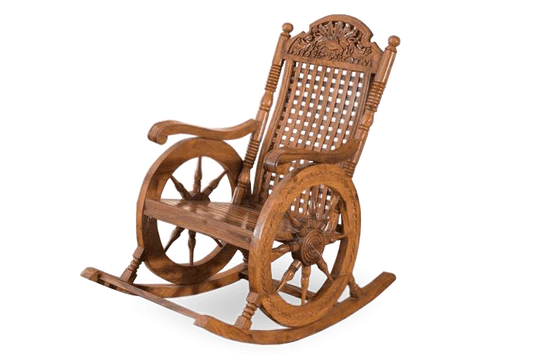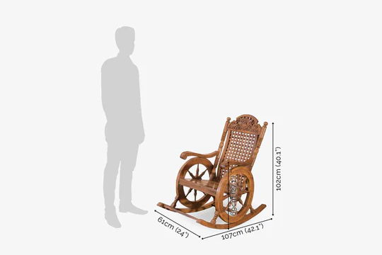 Elevate your living space with the Natural Art & Crafts Retro Wheel Design Hand Carved Teak Wood Rocking Chair. This masterfully handcrafted rocking chair is made from premium-quality teak wood, featuring a striking retro wheel design and a luxurious honey finish. Its sturdy construction ensures durability, while the vintage aesthetic brings timeless charm to any room or patio. Whether placed indoors or outdoors, this teak wood rocking chair offers superior comfort and elegant style, making it an ideal choice for relaxation and decor. Perfect for living rooms, porches, and reading nooks, this heirloom-quality chair is a must-have for any home.