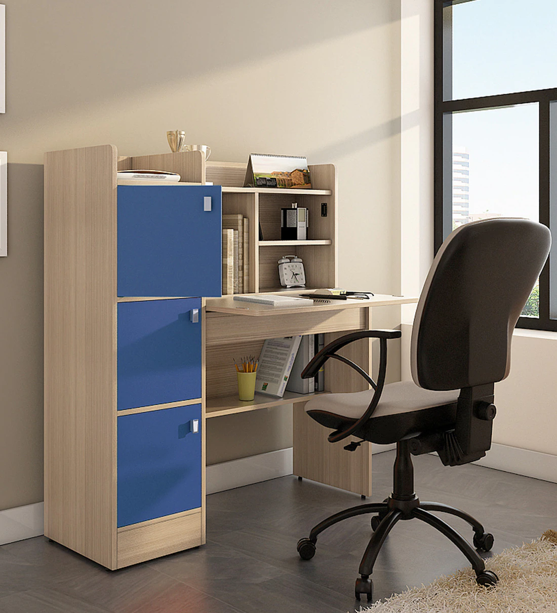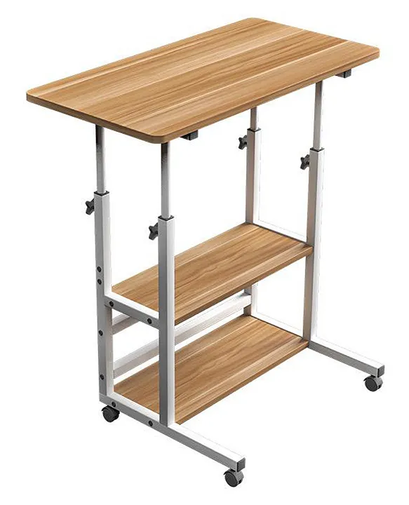 A wooden study table or office desk provides a stable and comfortable workspace.
